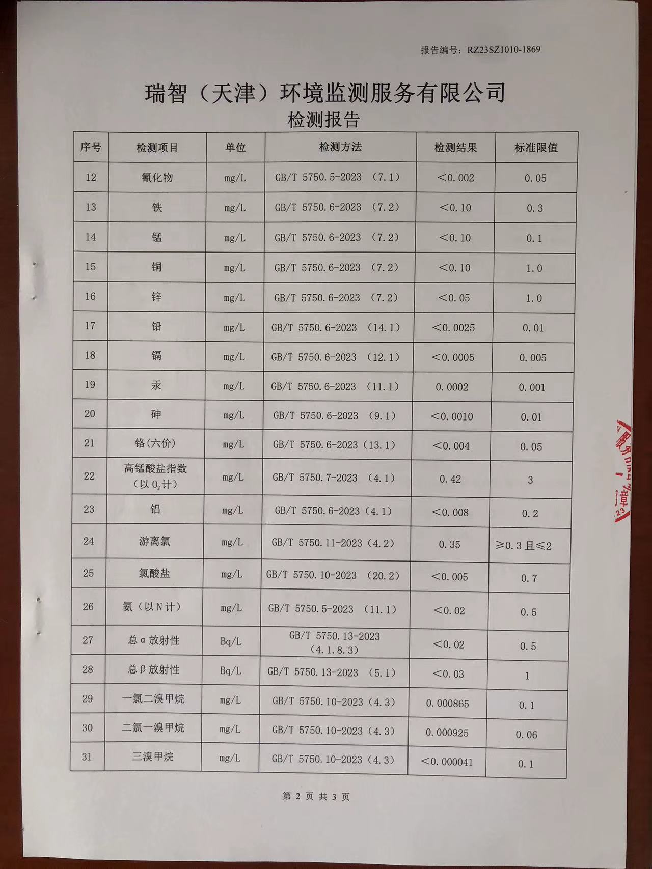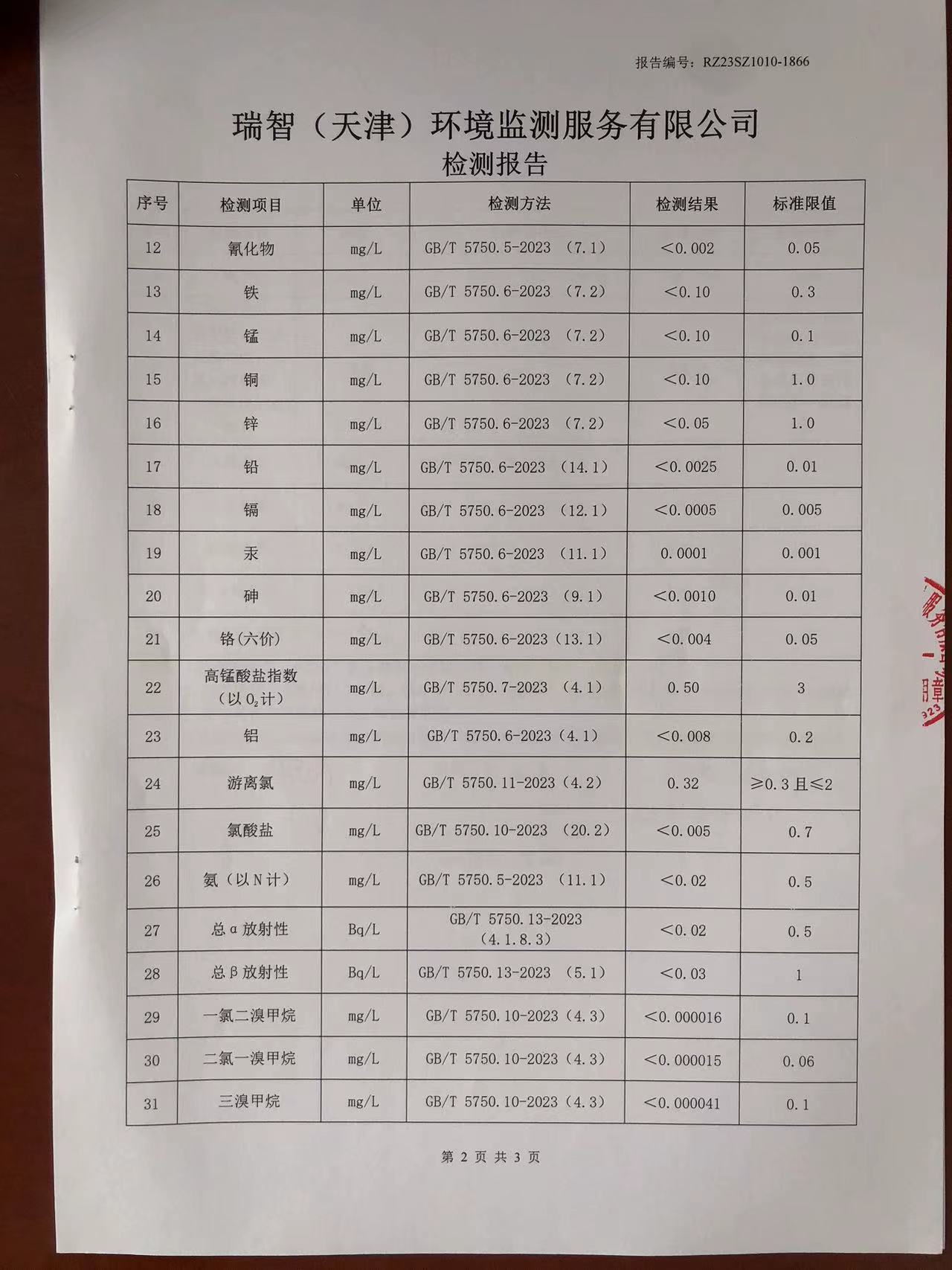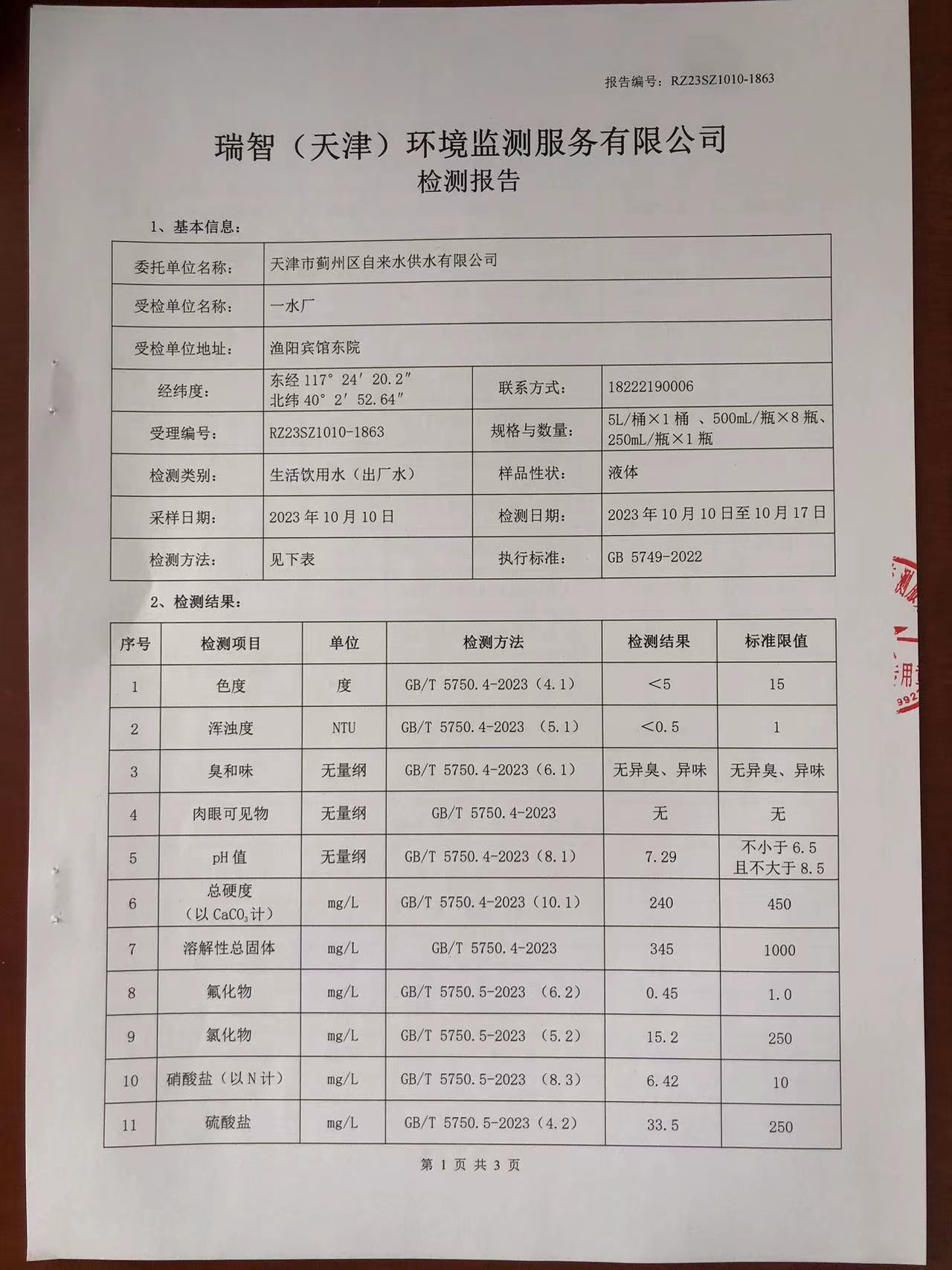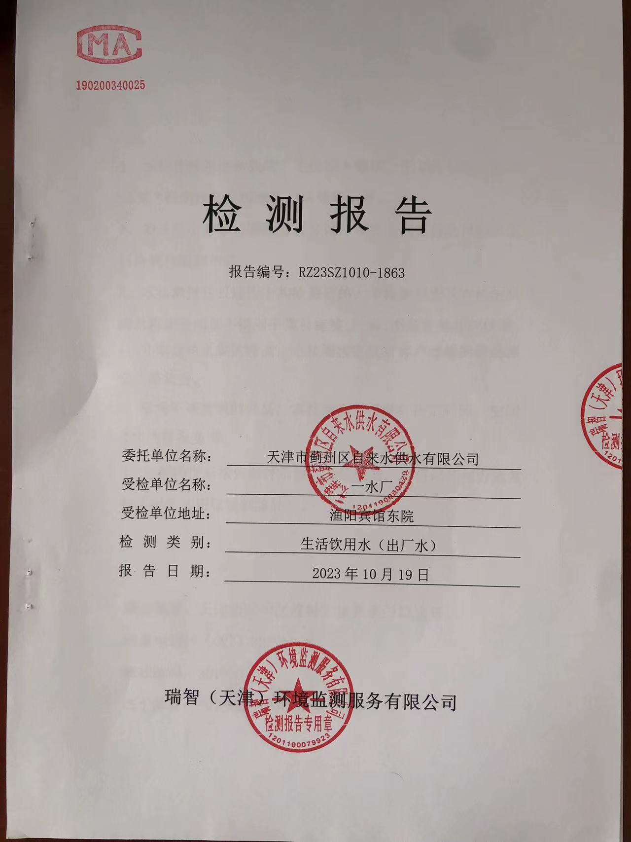 2023年10月份水質(zhì)檢測報告