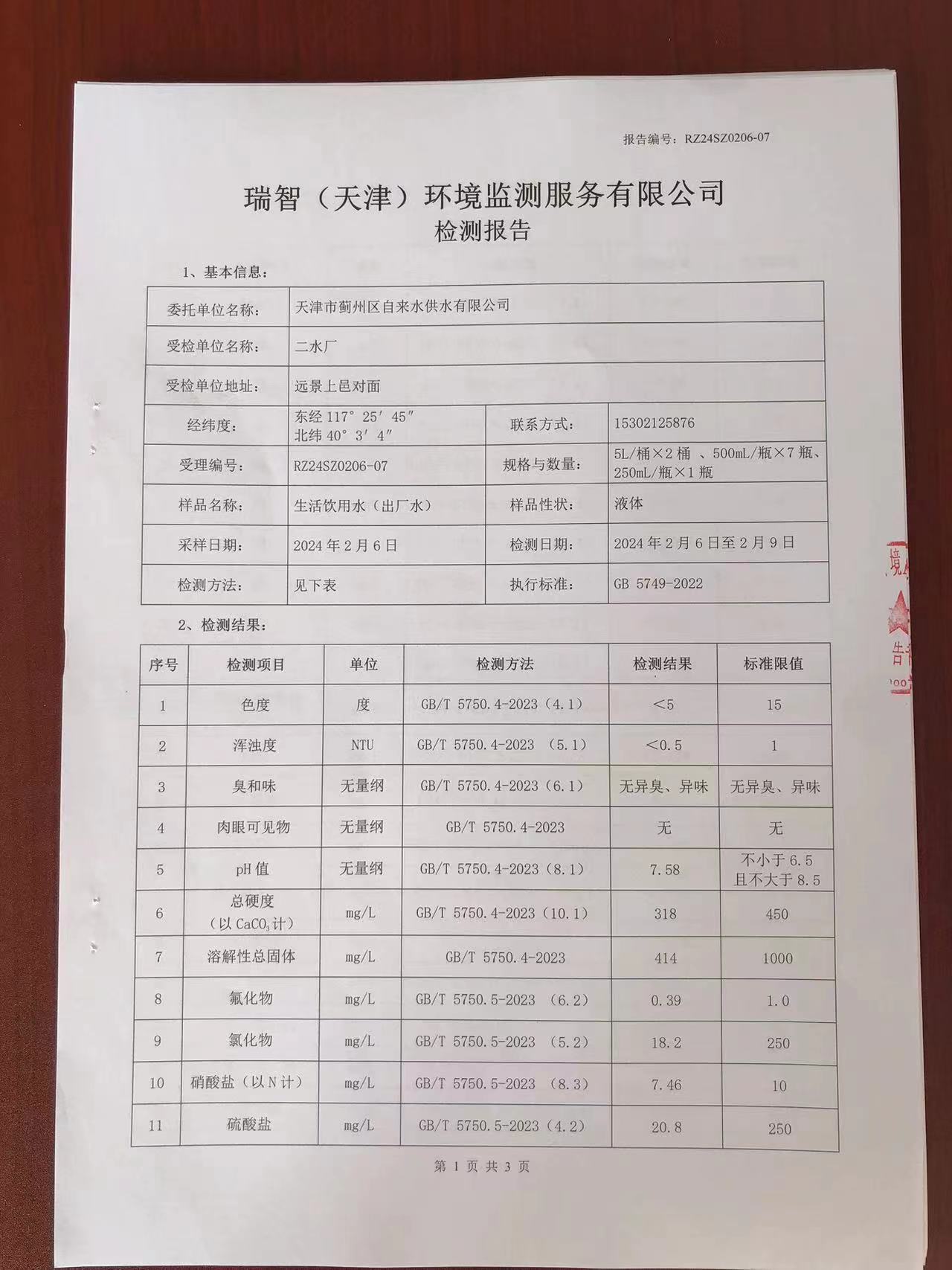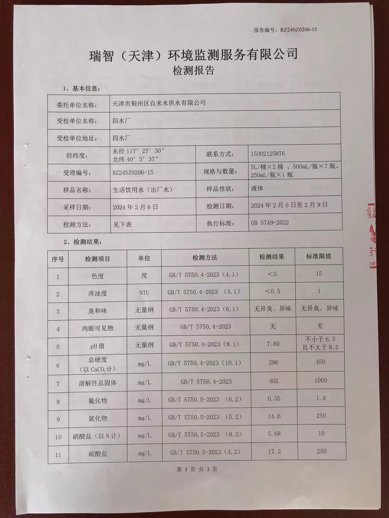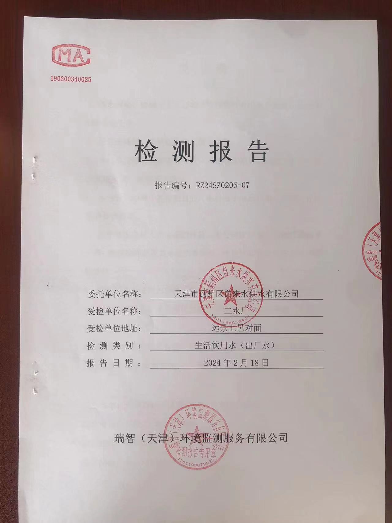 2024年2月份水質(zhì)檢測報告