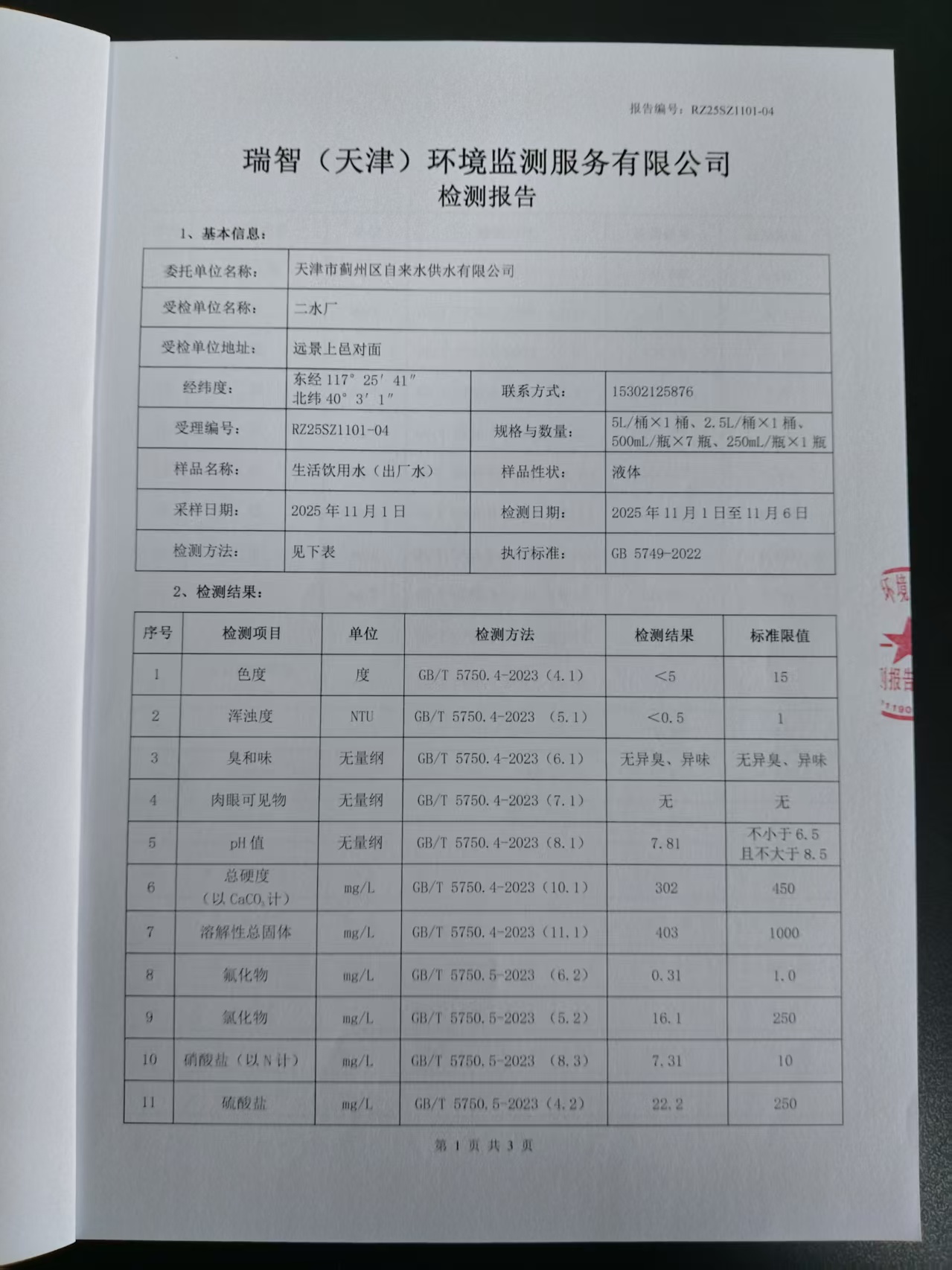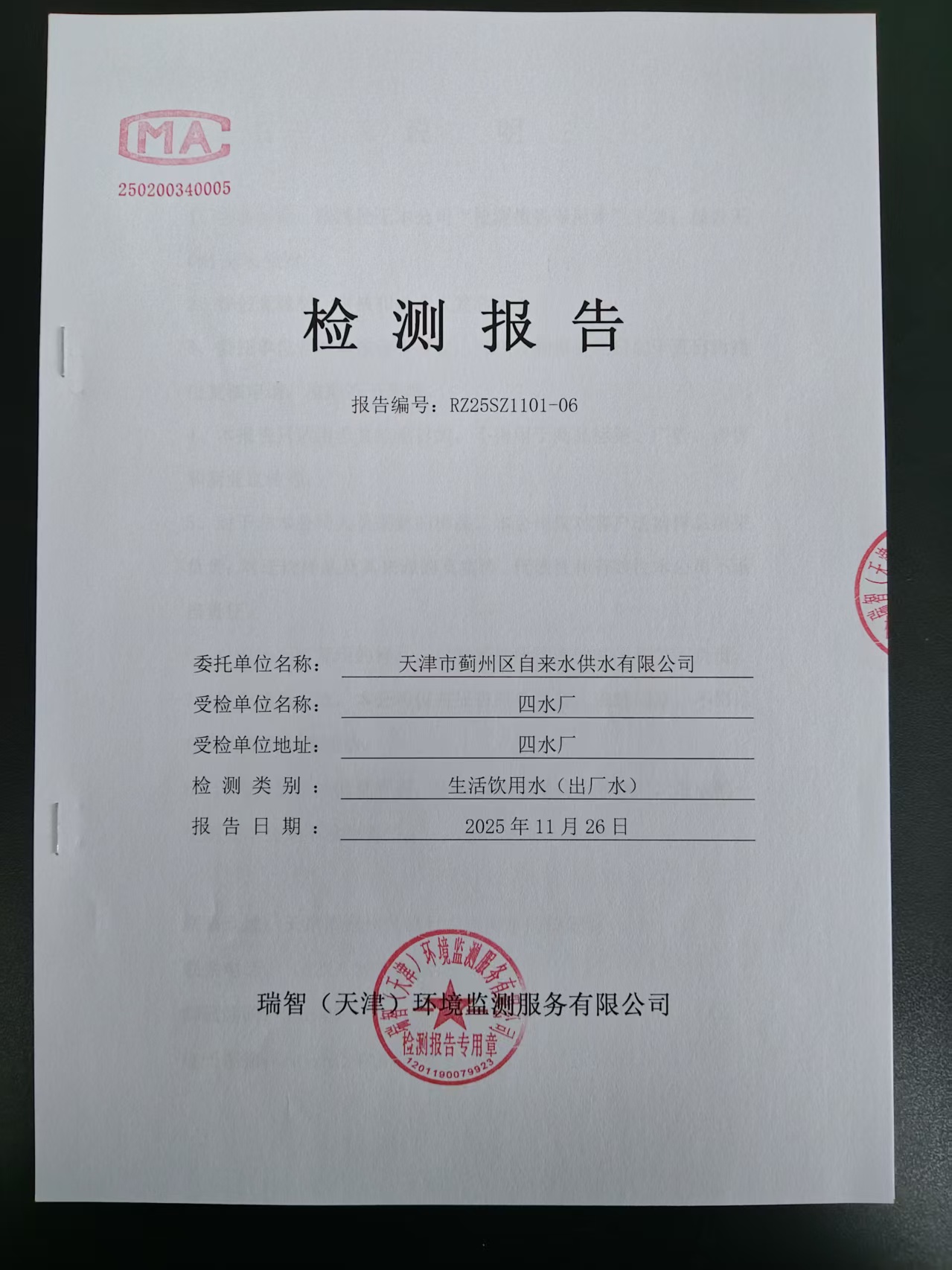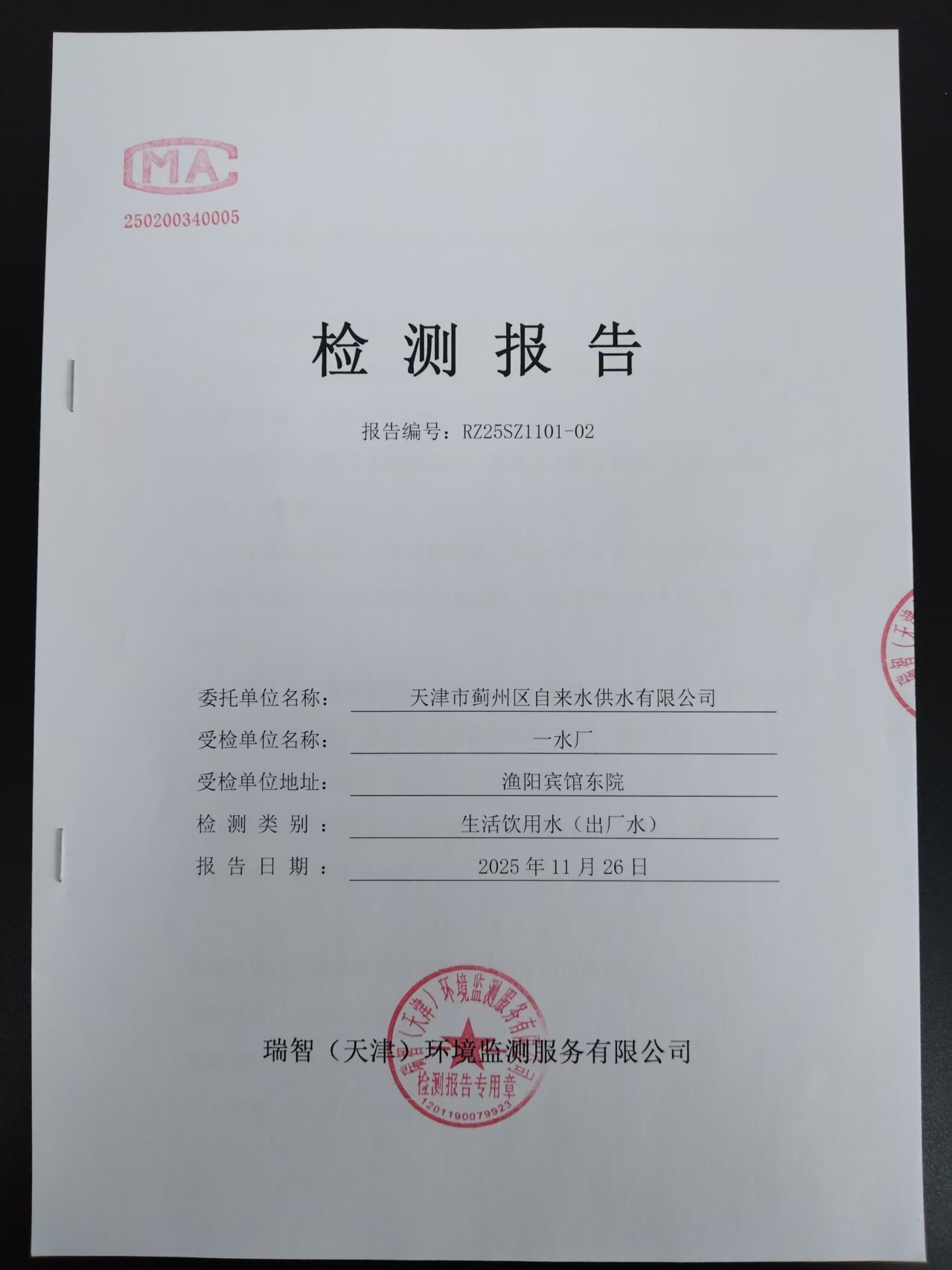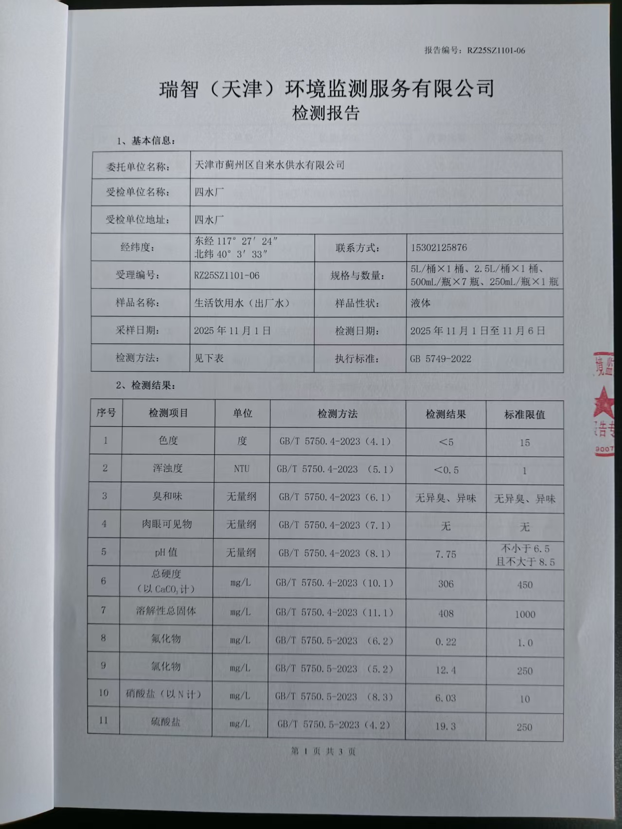 2025年11月份水質(zhì)檢測(cè)報(bào)告