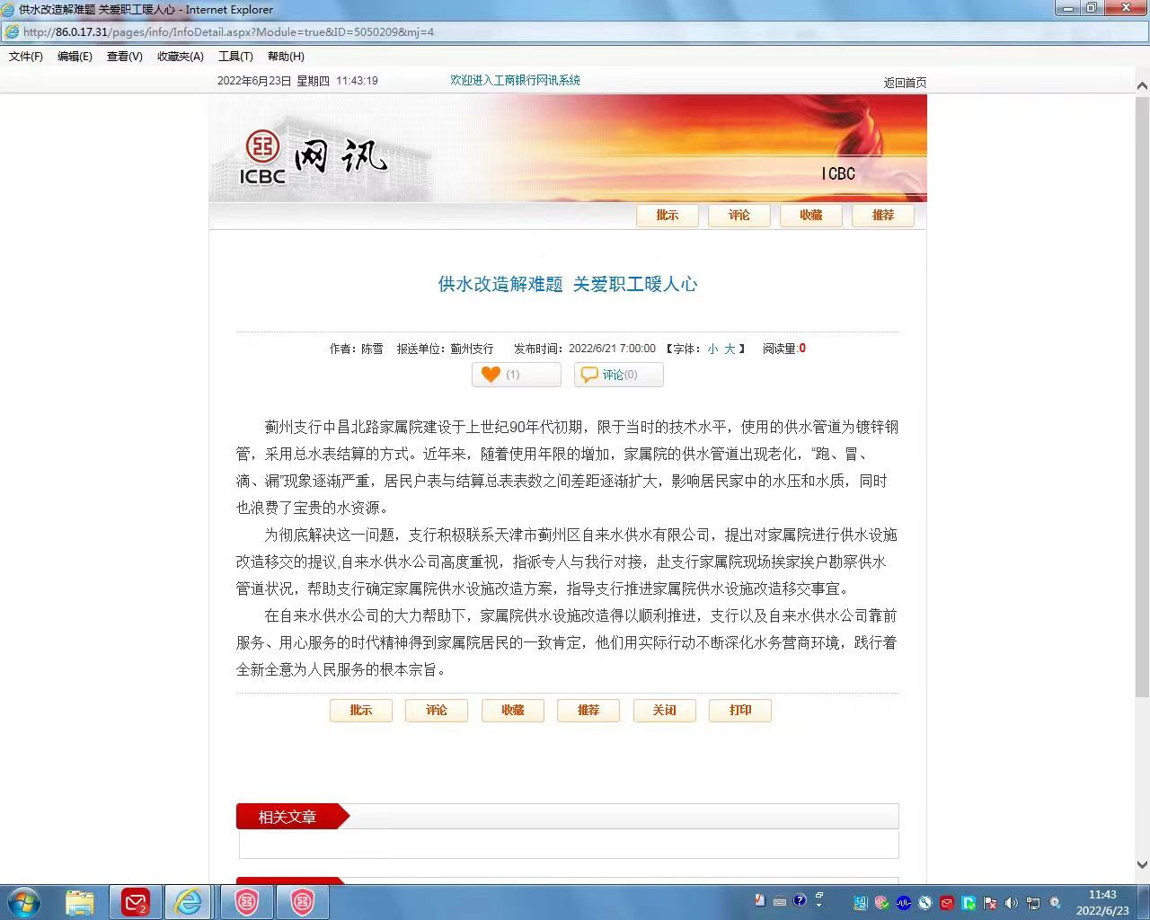 為徹底解決工行家屬院的供水問(wèn)題,工商銀行天津市薊州區(qū)支行聯(lián)系我公司提出對(duì)家屬院進(jìn)行供水設(shè)施改造移交的提議。我公司高度重視,立即指派專人與工行對(duì)接,向工行工作人員耐心講解相關(guān)政策及辦理流程。主動(dòng)赴工行家屬院現(xiàn)場(chǎng)挨家挨戶勘察供水管道狀況,幫助工行確定家屬院供水設(shè)施改造方案,指導(dǎo)工行推進(jìn)家屬院供水設(shè)施改造移交事宜,使工行天津薊州區(qū)支行家屬院改造實(shí)現(xiàn)了“零資料”和“零跑腿”,用實(shí)際行動(dòng)踐行全心全意為人民服務(wù)的宗旨,獲得了工商銀行的認(rèn)可。工商銀行于2022年6月21日在工商銀行網(wǎng)訊系統(tǒng)以“供水改造解難題 關(guān)愛職工暖人心”為題對(duì)該家屬院改造的相關(guān)情況進(jìn)行了刊登報(bào)道。