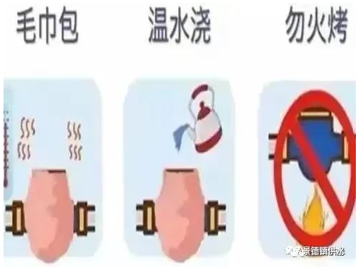 1、對已凍住的水龍頭、閥門、水管,用戶可以用熱毛巾裹住水龍頭,然后澆灑溫水,使水龍頭解凍再擰開水龍頭,用溫水沿水龍頭慢慢向管子澆灑,使水管解凍。切忌用火燒烤或用開水激燙,這樣反而容易導(dǎo)致水管爆裂。  2、如果是家中水表受凍結(jié)冰,切忌用過熱的開水直接沖淋水表表面,應(yīng)使用不超過50攝氏度的溫水沖淋,切忌用火烘烤。如水表表面玻璃已經(jīng)凍裂,用戶要立即與天津市薊州區(qū)自來水供水有限公司聯(lián)系。